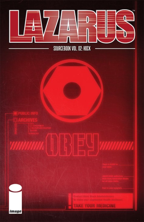 The New York Times bestselling creative team of Greg Rucka (THE OLD GUARD, BLACK MAGICK) and Michael Lark (Daredevil)—with contributions from Eric Trautmann, Neal Bailey, David Brothers, Robert Mackenzie, and Dave Walker—will release LAZARUS SOURCEBOOK #2: HOCK this April, after the close of the ongoing series’ fifth arc.